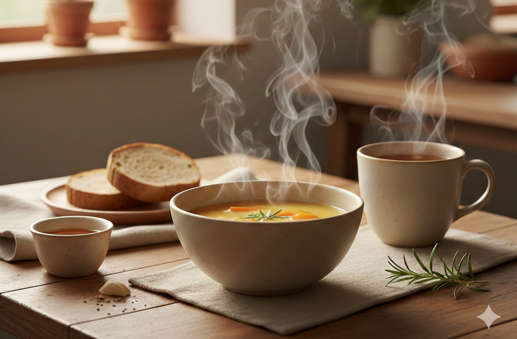 朝は体温がまだ十分に上がりきっていない時間帯です。冷たい飲み物だけで済ませるのではなく、白湯や温かいスープを取り入れることで、内側からゆっくりと目覚めを促すことができます。具だくさんの味噌汁や、温かいおかゆなどは、胃腸にやさしく、穏やかなスタートを支えてくれます。忙しい朝でも、何かひとつ「温かいもの」を加える意識が大切です。